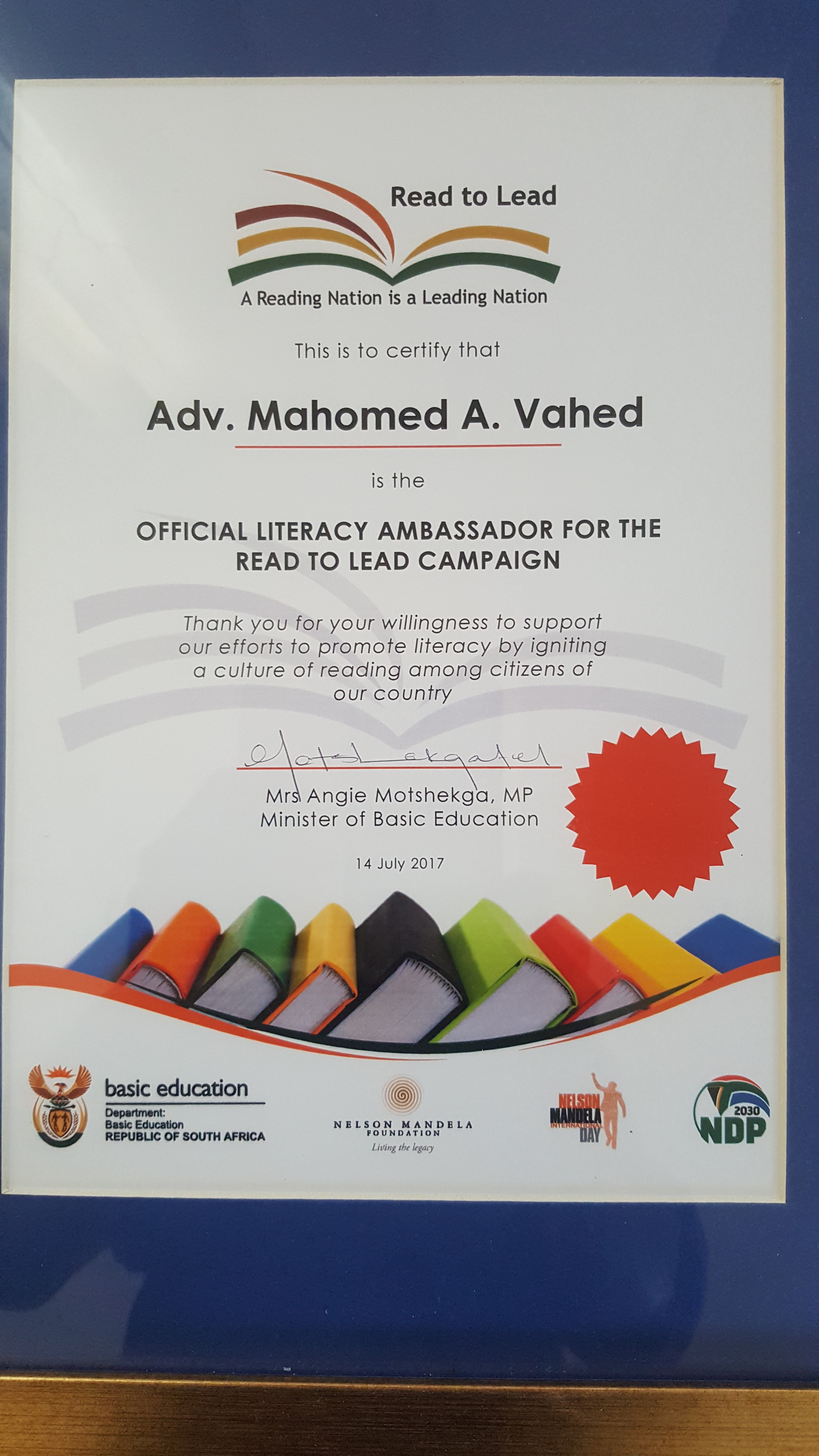 In 2017 Adv. Vahed was appointed a Literacy Ambassador by the Department of Basic Education. Through his reading presentations at schools he has reached 5,000+ learners in the past two years alone.